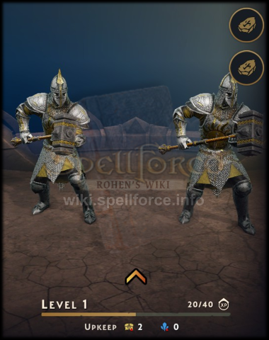They are the backbone of human forces, the basic troops, which constitute the core of any army. They are wearing strong armour from the fine forges of the realm. Not only their armour, but also their heavy shield provides great protection, and their flashing blades are an example of the exceptional sword forging skills of humans. Apart from their duties in battle, during times of peace, the soldiers also guard the cities and the borders of the realm.